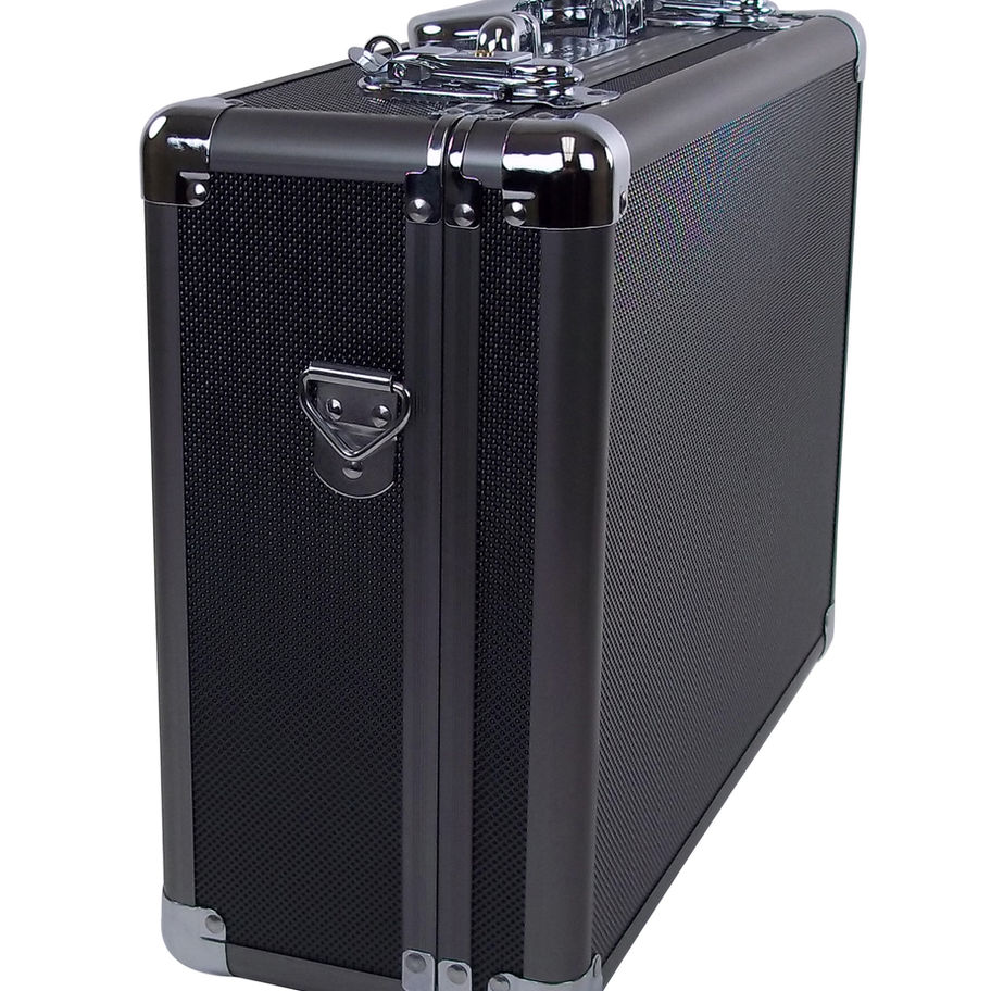 The exterior features an aluminum alloy frame with steel-reinforced corners and textured ABS panels with gunmetal trim. Metal triangle rings accommodate a removable shoulder strap, while a padded hinged handle and hard plastic “feet” ensure stability and protection when setting the case down or storing it.